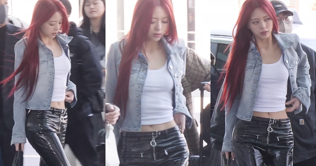 가죽 스키니 의상과 '새하얀 민소매'로 아름다운 공항패션 선보이는 '있지의 유나'