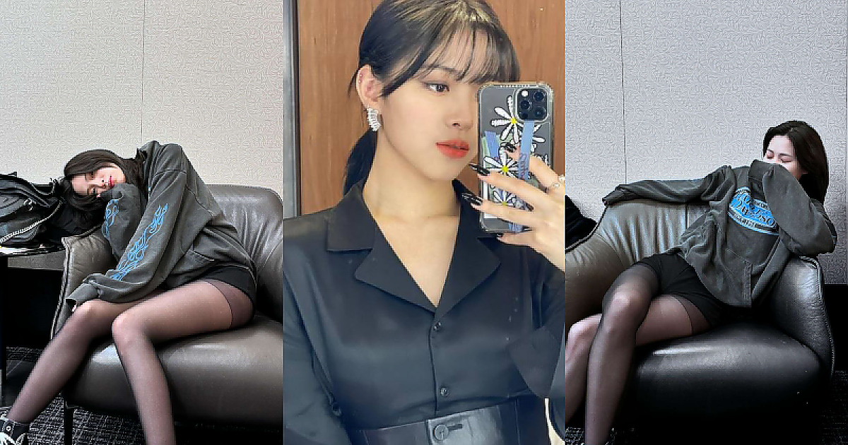 지쳐서 소파에 기대있는 '있지 류진' 하의실종 의상 컨셉으로 아름다움 과시
