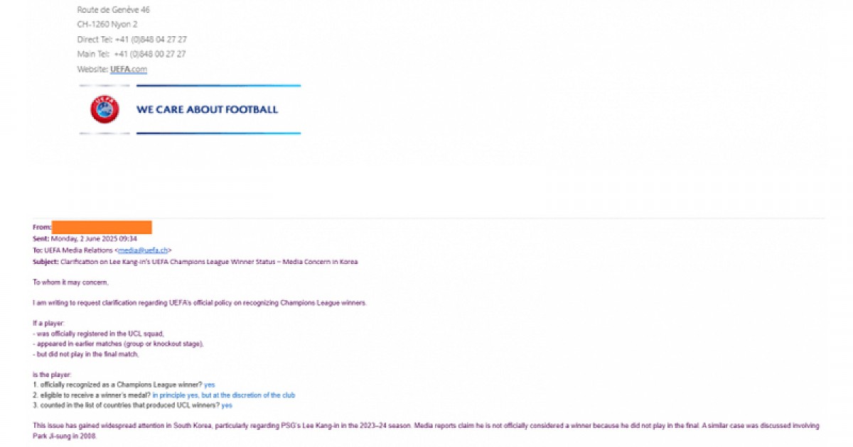 이강인 챔피언스리스 우승자로 인정되냐는 질문에 온 UEFA 공식답변