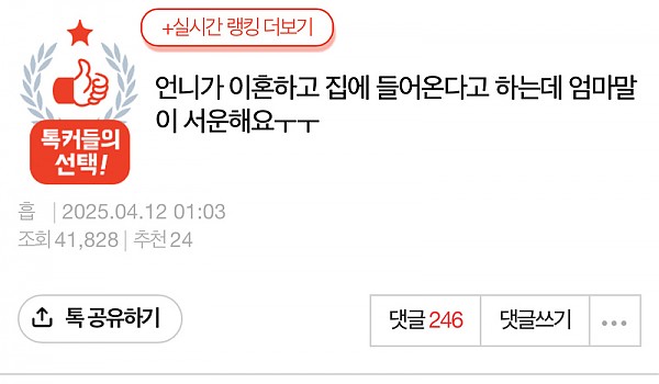 언니가 이혼하고 집에 들어온다고 하는데 엄마말이 서운해요ㅜㅜ