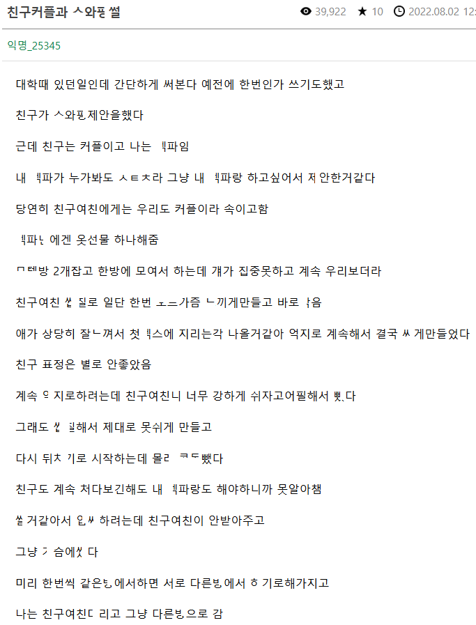 친구커플과 스ㅇㅍ 하고 뒤로 몰래 만나서도 ㄸㅁ은 썰