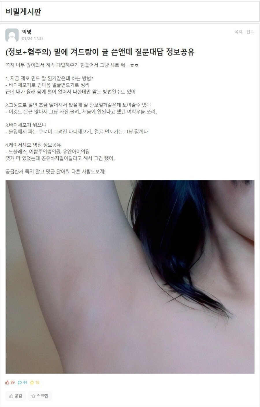 글 하나 올렸다가 온라인에 사진 퍼진 겨드랑이녀