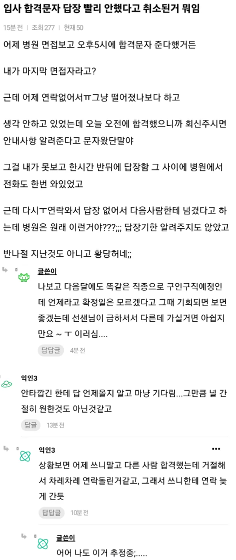 면접 후 합격 문자 답장을 늦게 했다고 합격 취소됨