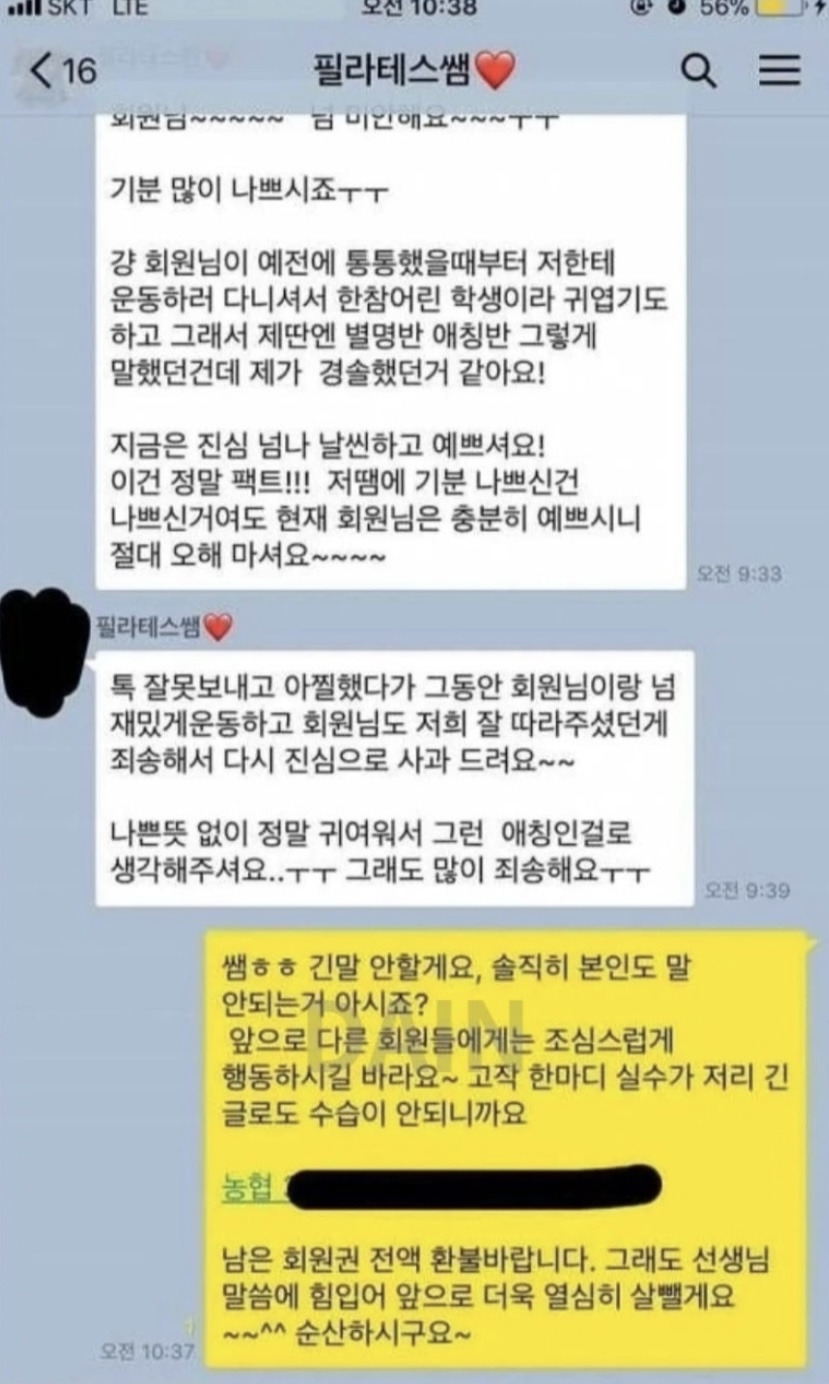 회원에게 톡 잘못보낸 필레테스 강사 레전드