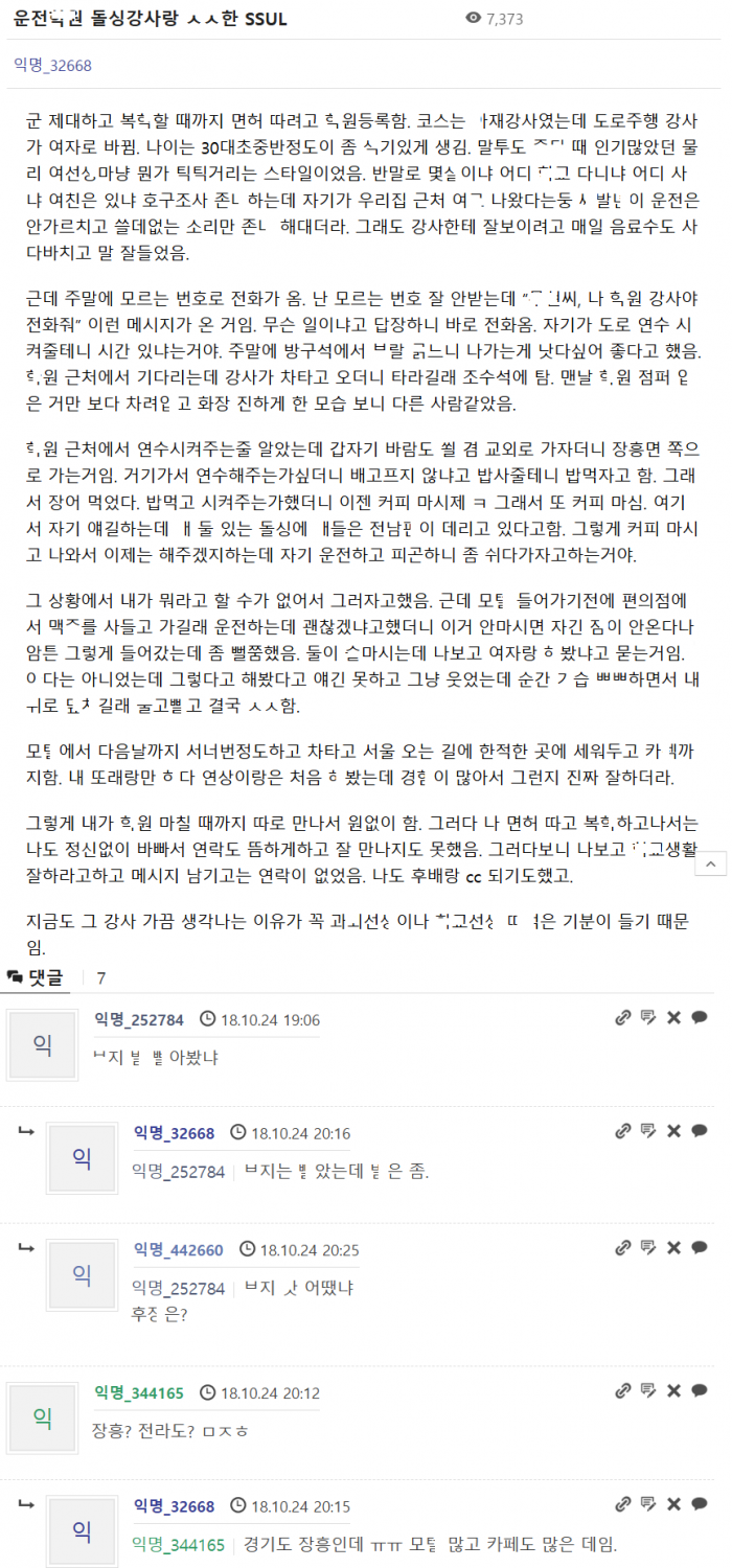 운전ㅎ원 돌씽강사한테 ㅈㅈ ㅃ리다가 ㄲ려서 한 만행