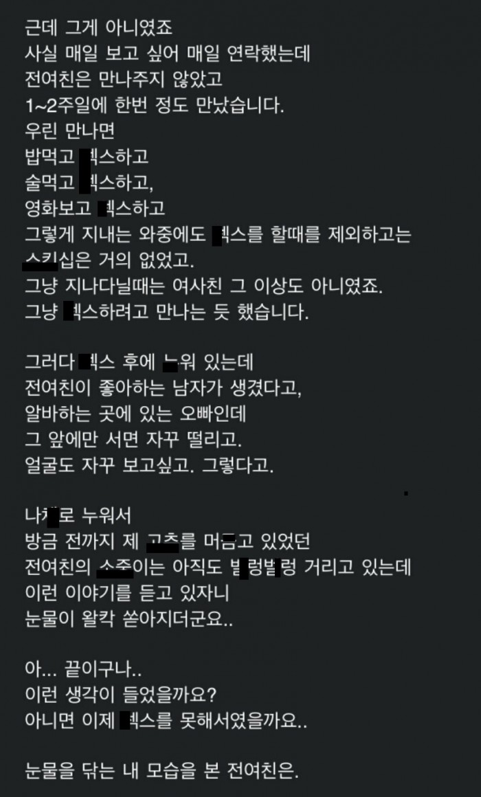 헤어졌던 전여친 보자해서 수년만에 다시 보자마자 ㅅㅅ하고 만날때마다 ㅅㅅ했었는데..
