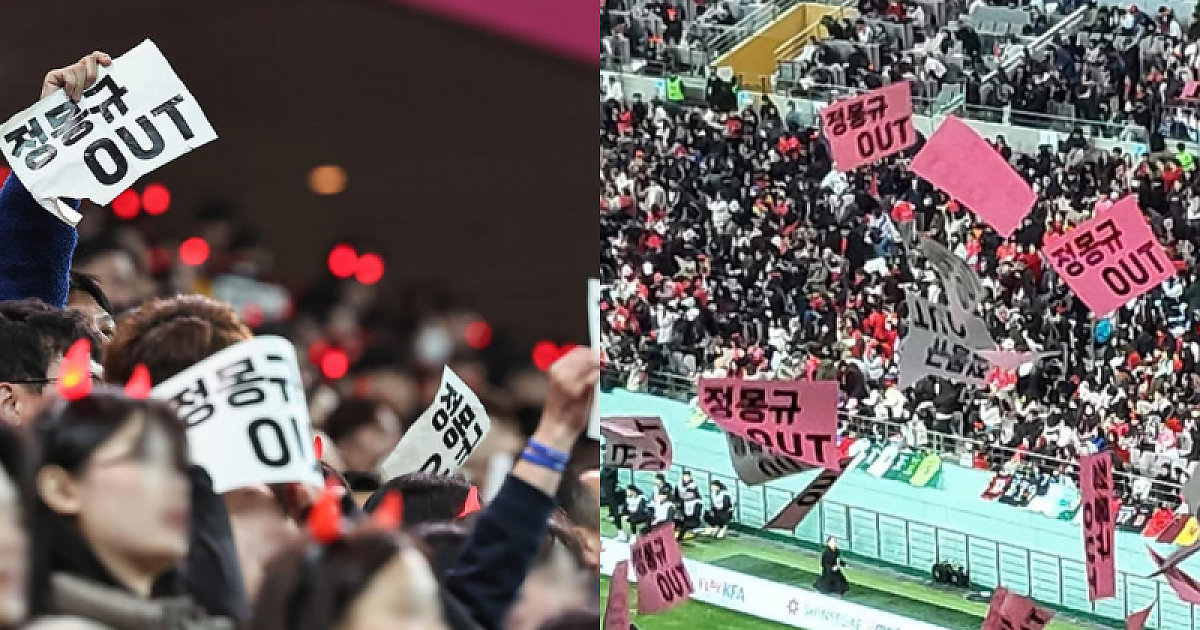 한 남성이 대한축구협회장 정몽규를 겨냥하는 종이를 관중석에 흩뿌리며 화제가 되었다.