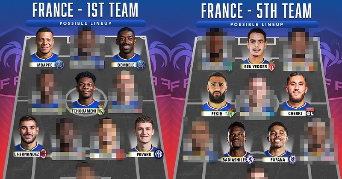 프랑스의 스쿼드 뎁스 1군 부터 5군까지 5팀, 5군에도 모르는 선수가 없다. (스쿼드 포함) 배민 축구 0 0 0 2024.03.21 12:03 링크복사 축구전문매체 '스코어 90'은 20일, 프랑스 국적의 선수로 1군(퍼스트팀)부터 5군(피프스팀)까지 5팀을 꾸렸다. 프랑스의 스쿼드 뎁스가 얼마나 두터운지를 보여주기 위한 의도다. 프랑스는 2월 현재 FIFA 랭킹 2위를 달린다. 디디에 데샹 프랑스 대표팀 감독은 이 멤버 위주로 이번여름에 열리는 유로2024에서 우승에 도전한다. 공격부터 수비까지 밸런스가 잘 짜인 스쿼드다. 링크복사 0 배민 0 0