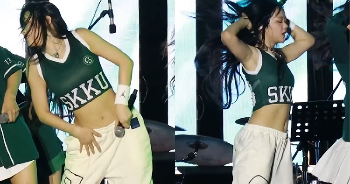 대학 행사에서 밀착 크롭 나시티를 입고 보여준 뉴진스 '하니'의 몸매 클래스 ㄷㄷ.gif