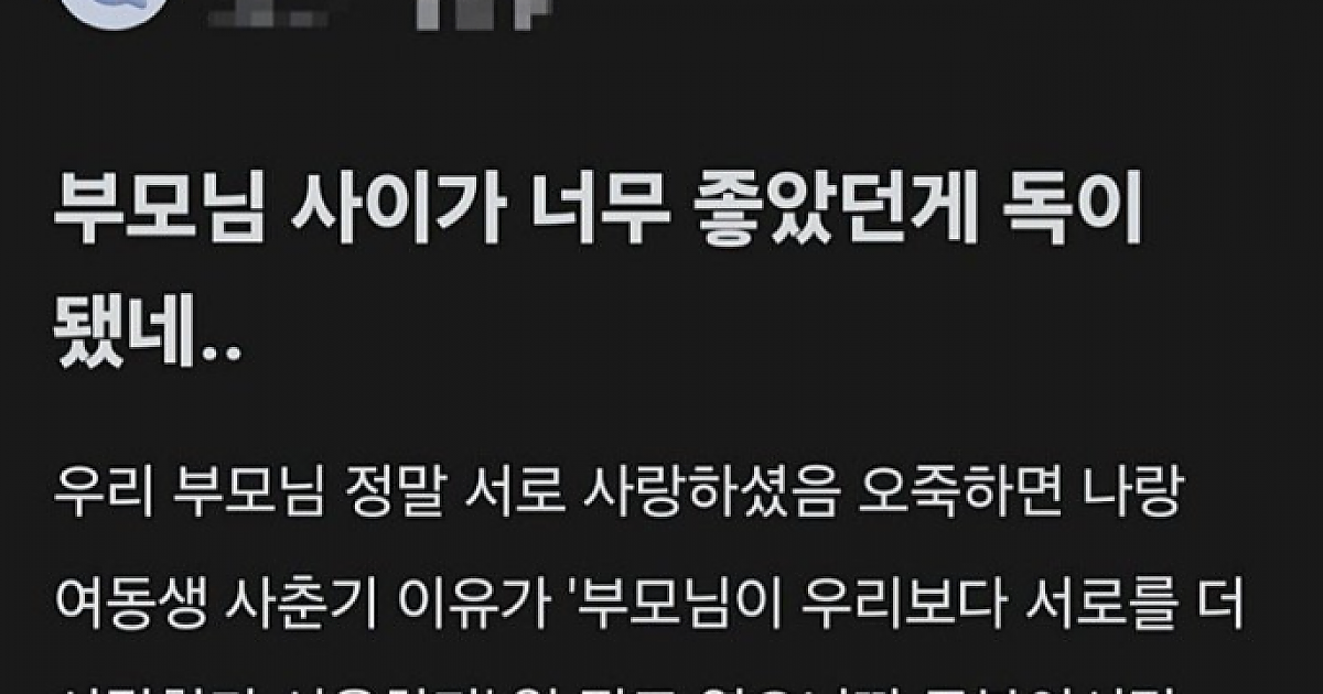 부모님 사이가 좋았던게 독이됐네 킬링타임 유머 0 3 0 2024.03.13 21:54 링크복사 항상 같이 있었는데 사라진다면 그 공허함을 어떻게 메꿀 수 있을까... ㅠㅠㅠ... 링크복사 0 킬링타임 0 0