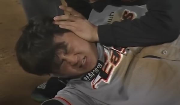 도루 견제구에 맞아 얼굴에 새겨진 야구공 실밥 자국