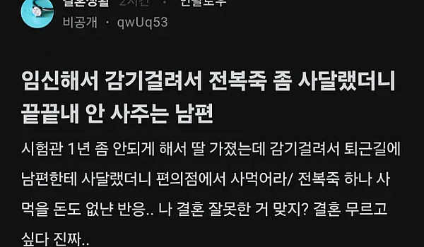 아픈 임신한 아내의 부탁 거절하는 남편