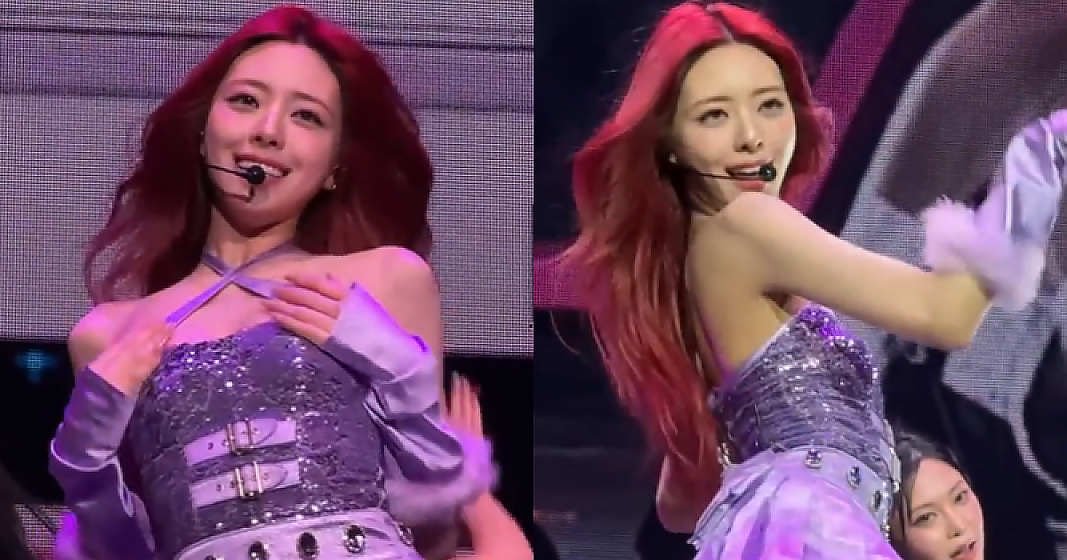 보라빛 숏 원피스 입고 무대 선 ITZY 유나.gif