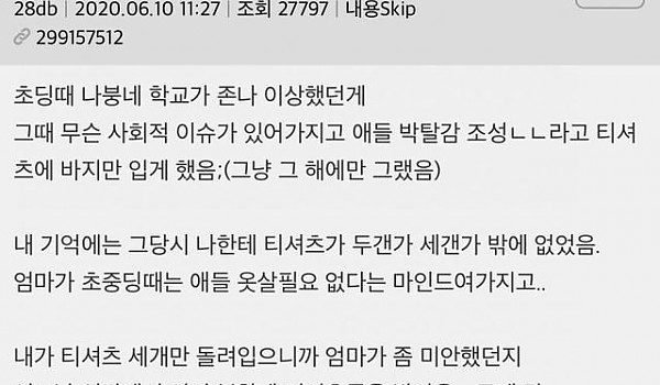 나 초딩때 옷때문에 교무실 불려가고 엄마도 불렀는데