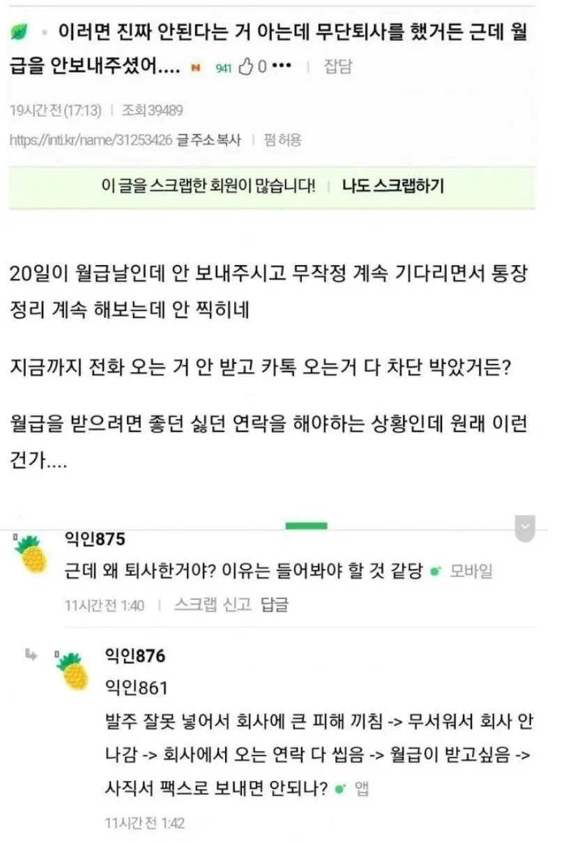 무단퇴사 했는데 월급을 안보내준 레전드