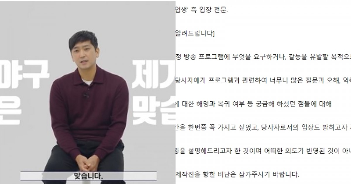 [최강야구] (공식)심수창, '최강야구' 폭로 논란에 "갈등 유발 아냐, 제작진 비난 말길"