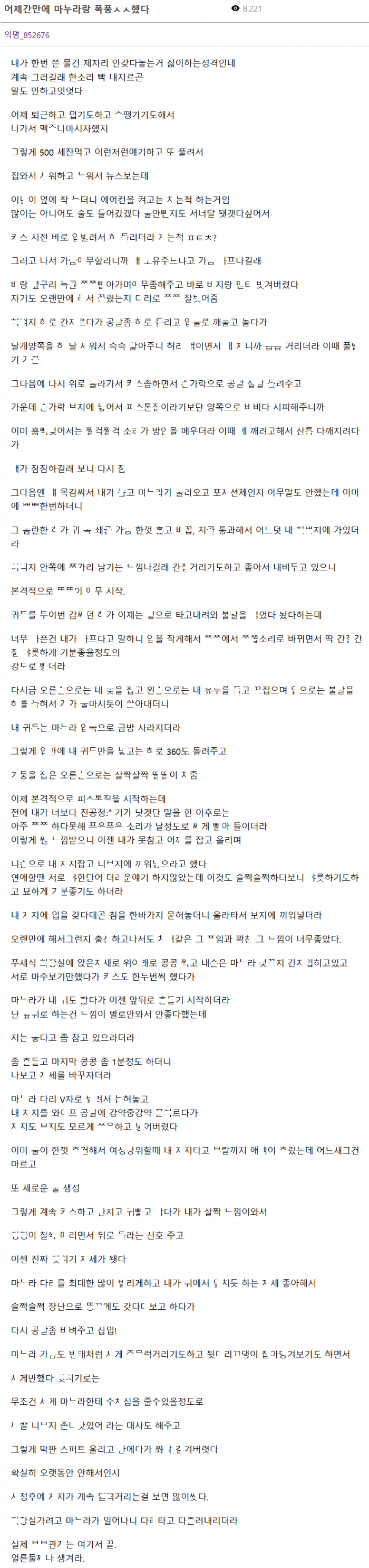 어제 간만에 마ㄴ라랑 폭풍 ㅅㅅ했다