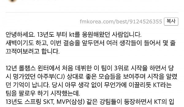 각종 커뮤니티에서 화제인 12년간 KT를 응원해온 팬의 월드 결승전을 앞둔 소감ㄷㄷ.jpg