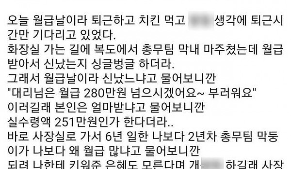 막내 여직원이 월급 더 받아서 사직서 쓴 사람