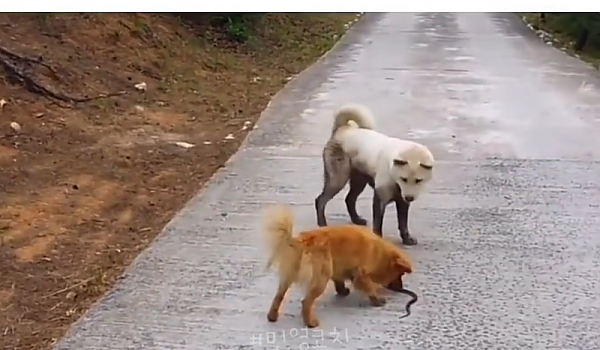 길에서 뱀을 마주친 시골 강아지의 반응