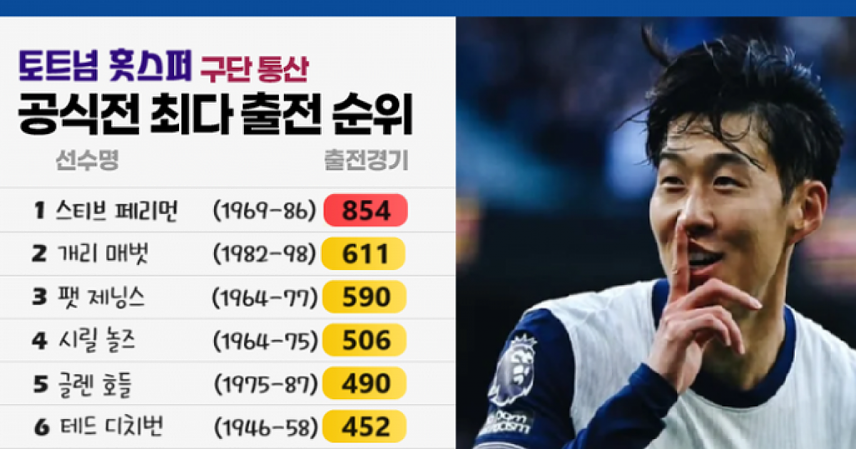토트넘 올타임 출전.png [오피셜] 손흥민, 요리스를 제치고 21세기 토트넘 최다 출전자 1위