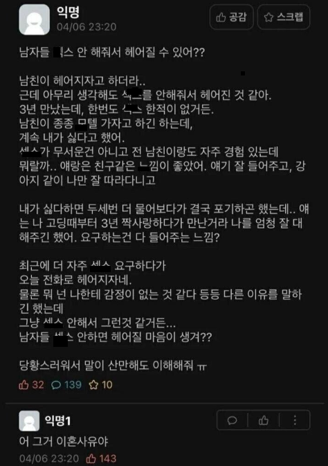 남자들 ㅅㅅ안해줘서 헤어질 수 있어?
