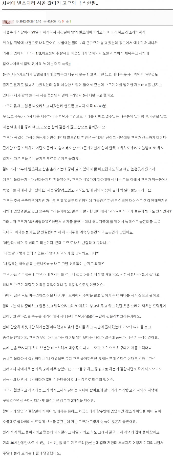 벌초하러 시골 갔다가 거ㄷ한 ㄱㅅ을 가진 고ㅁ와 생긴 일