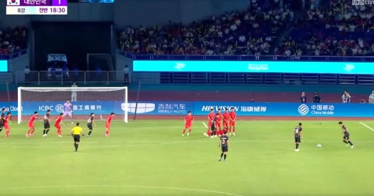 아시안게임 8강 중국전 기선을 제압해버리는 홍현석의 프리킥 수준