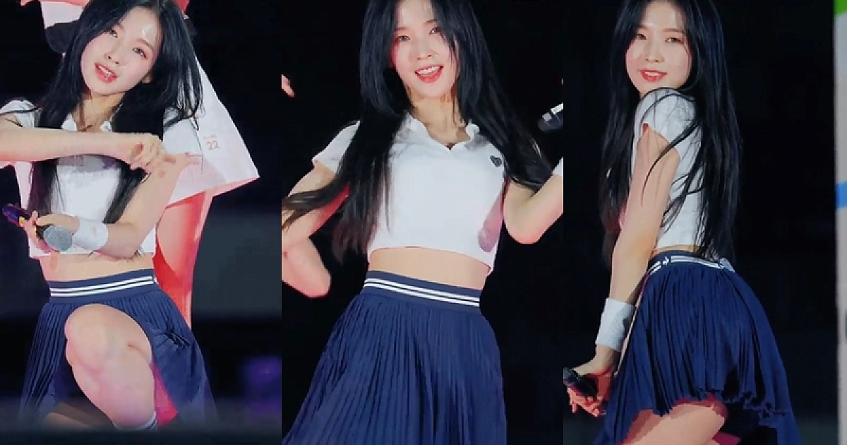 배꼽 흰폴로티 테니스치마 입고 역대급 안무 선보이는 오마이걸 아린.gif